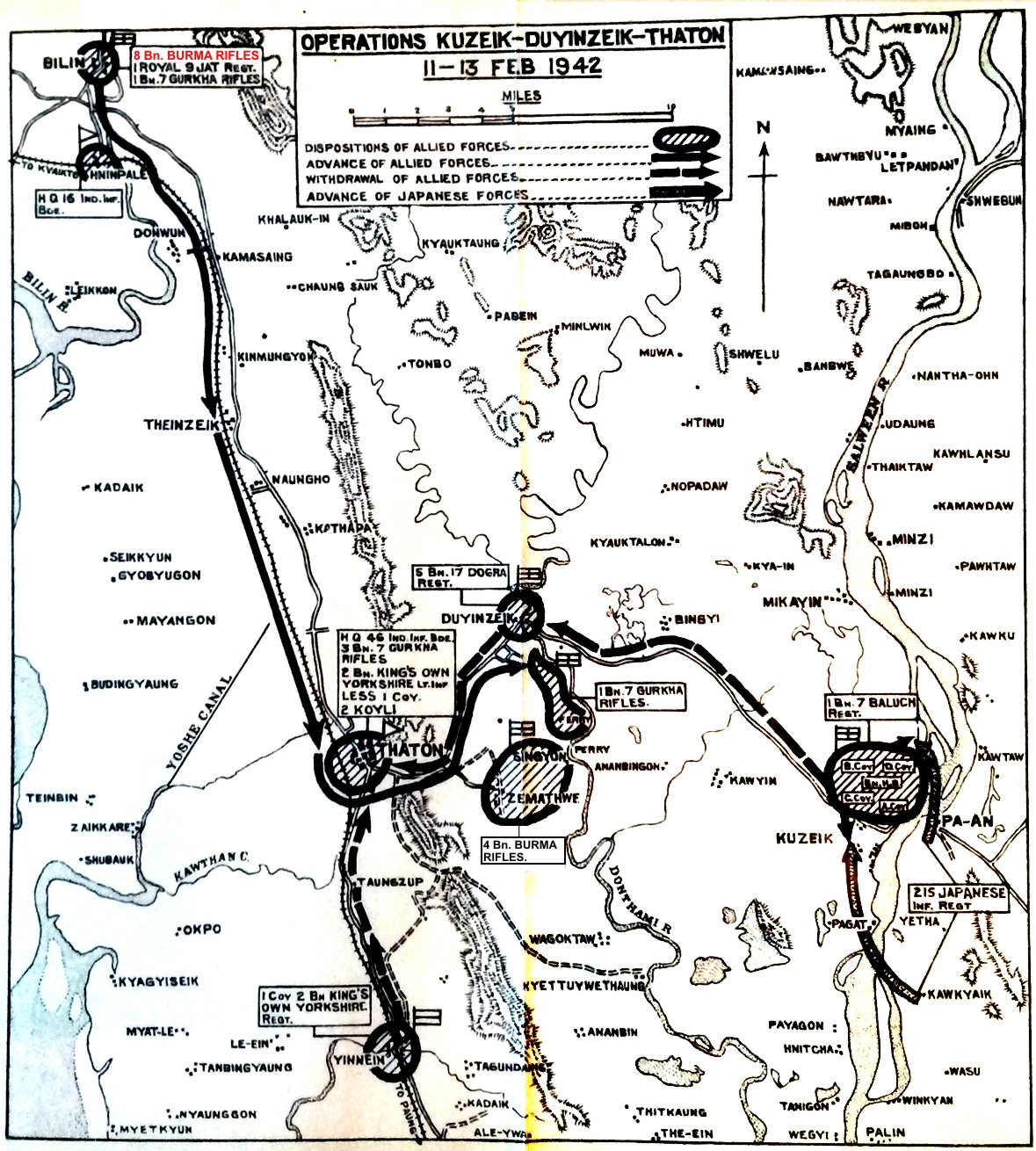 On the 6th February 1942, the Battalion left Kyaikto for Hninpale, near Bilin, where the next day it came briefly under command of the 46th Indian Infantry Brigade, 17th Indian Infantry Division. The day after, the Battalion was re-assigned to the 16th Indian Infantry Brigade. Captain P.H.M. Galbraith took his ‘A’ Company and a detachment from the Battalion Headquarters Company on special assignment. For the next few days, the Battalion defended the area around Hninpale and the road and rail crossings over the Bilin River. On 17th February, a further change of command was made, this time the Battalion coming under the 48th Indian Infantry Brigade when this brigade came forward to reinforce the British line. During this period, the Battalion shifted position to the Bilin area. The Battalion came under attack by the Japanese later on 17th February. Three days later, a withdrawal was ordered and the Battalion found itself back at Kyaikto on 21st February.