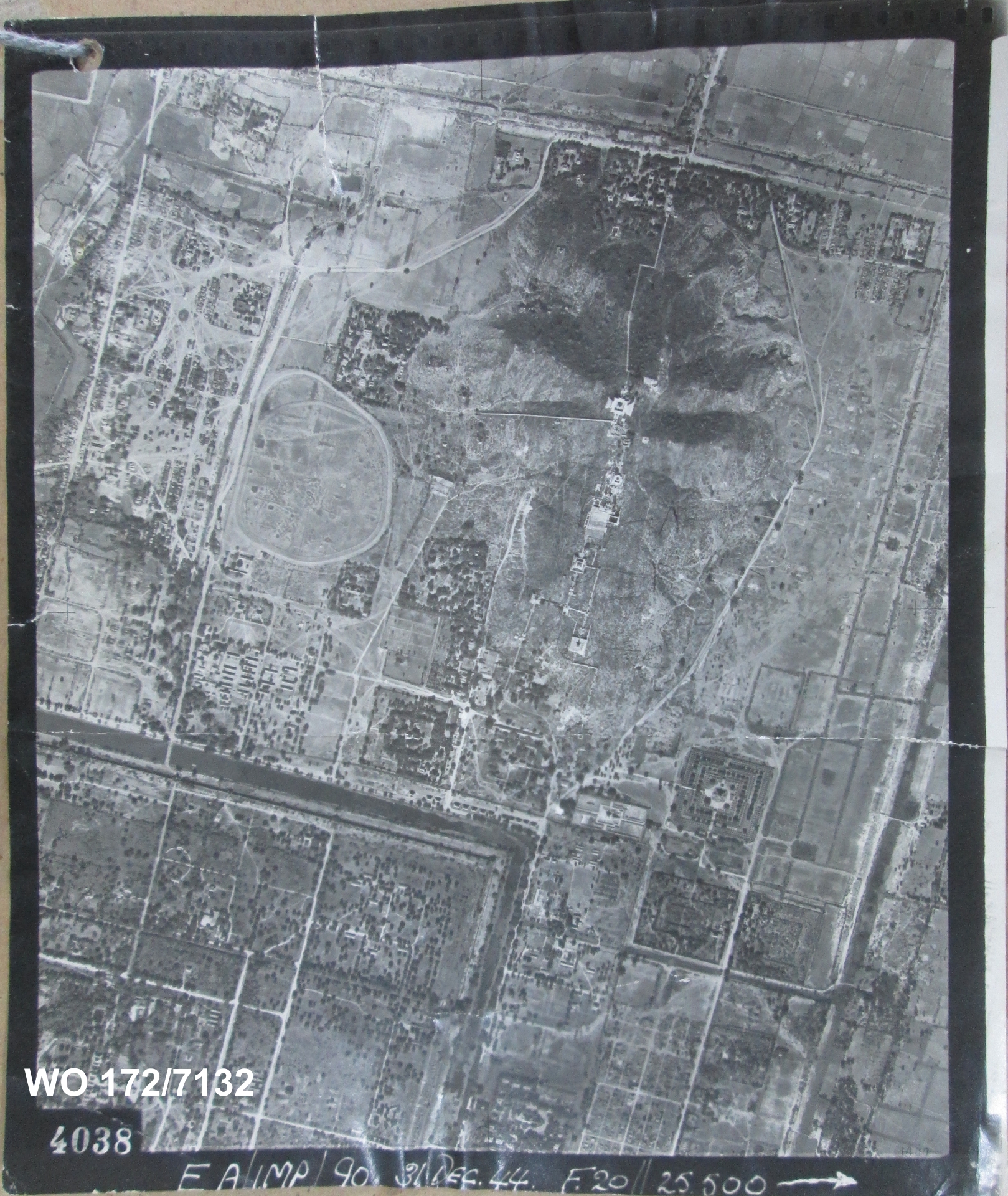 An aerial reconnaissance photograph of northern Mandalay, taken 31st December 1944. Clearly seen are: Mandalay Hill (top centre); the racecourse (to the left/west of the hill); the road leading to Fort Dufferin; the north moat and bridge across to the North Gate. (War diary 98th Indian Infantry Brigade, WO 172/7132.
