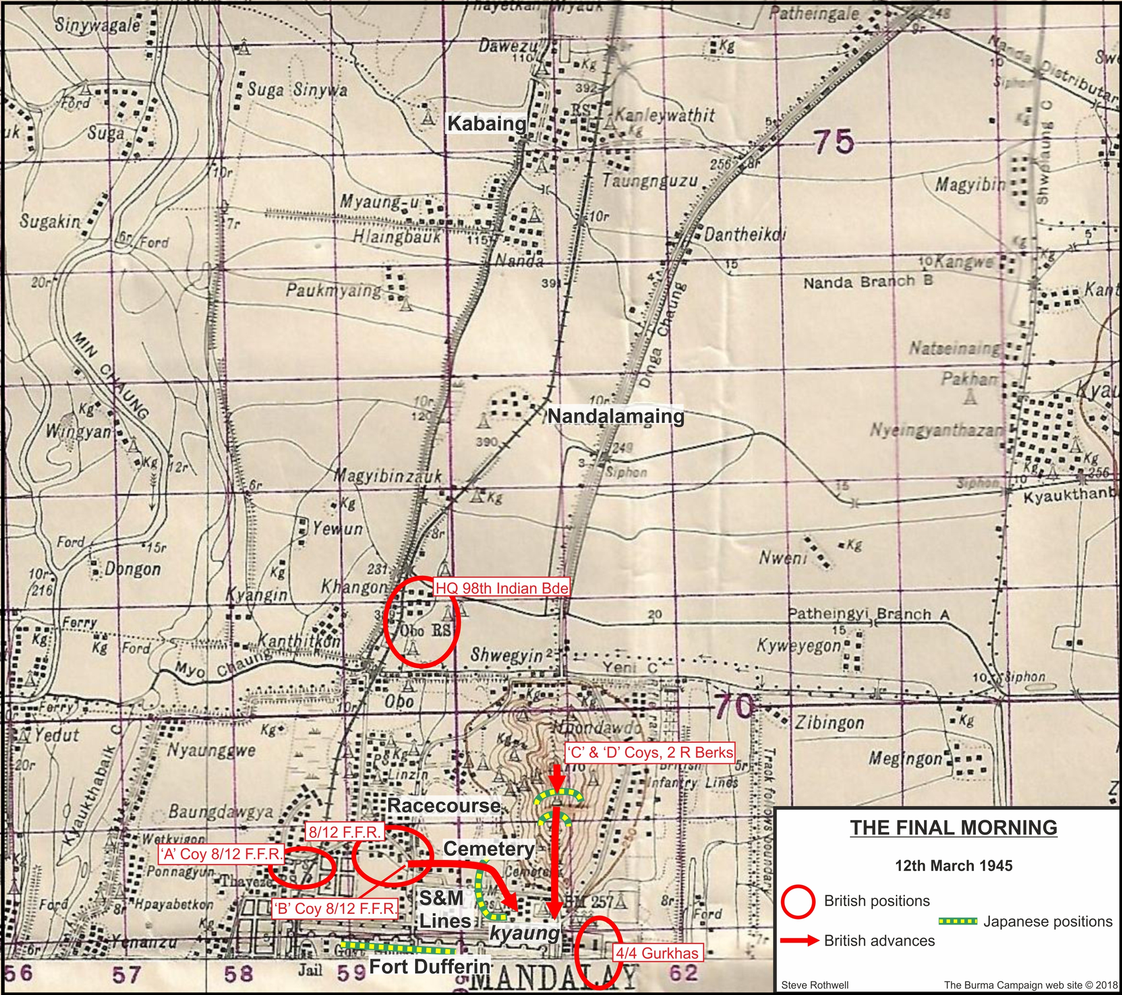At 09:00 that morning, the commander of the 98th Indian Infantry Brigade visited the 8th Battalion, 12th F.F.R. He passed on the news that much of Mandalay Hill had been captured with the exception of the southern spur. Informing the battalion that the 4th Battalion, 4th Gurkha Rifles and two companies of the 2nd Battalion, Royal Berkshire Regiment were now working their way down the hill from the north, the Brigadier ordered that a company of the 8th Battalion, 12th F.F.R. should be sent to take up a position in the area south of the cemetery to act as a 'flank stop' in support of the other two battalions. Shortly before 10:00, 'C' Company set off, with orders to provide the 'flank stop', ready to block any enemy movement westwards from the direction of the north east corner of Fort Dufferin when the 4th Battalion, 4th Gurkha Rifles advanced southwards on the east side of Mandalay Hill. ‘C’ Company was also to eliminate any Japanese snipers or gun positions that revealed themselves by opening fire from the fort wall. The company followed a route that took it north of the Sappers and Miners Lines towards the area of the cemetery and Buddhist 'kyaung' or monastery (marked 'Kg' on the map at 603681). At around 10:30, 'C' Company came under heavy fire from the area of the fort wall, from the southern slopes of Mandalay Hill and from the cemetery and 'kyaung' area. Light machine guns and snipers pinned down the Indian infantry who were horribly exposed on open ground. Casualties mounted as men were shot where they lay, the Japanese firing bursts at each man in turn. After some time, the company commander was able to crawl over to his wireless operator and arranged for smoke to be brought down to cover the withdrawal of his men. As the rearward platoon pulled back and the evacuation of the wounded started, further intense fire was opened up on anyone moving and more casualties were suffered. More smoke was laid down and gradually the men got back, the wounded either being brought out by stretcher or with the support of a comrade. During the final smoke barrage, some high explosive shells were also fired but this was ineffective as the Japanese positions could not be pinpointed. Shortly after 13:00, the company had completed its withdrawal from an area that the previous day had been reported as clear by the 4th Battalion, 4th Gurkha Rifles. The casualties were three killed and seventeen wounded. Captain E.E. O’Connor of ‘C’ Squadron, 150th Regiment, R.A.C. reported that; "No. 3 Troop in sp of one coy 8/12 FFR assisted the coy to clear the area of Kg 603681. This op was a complete success and no cas to tks were incurred." The operation was not a complete success as far as ‘C’ Company, 8th Battalion, 12th F.F.R. were concerned, and Captain O’Connor’s report must actually refer to the movement of ‘B’ Company, 4th Battalion, 4th Gurkha Rifles. The war diary of the 8th Battalion, 12th F.F.R. does not mention there being any tanks in support of the unfortunate 'C' Company.[40]