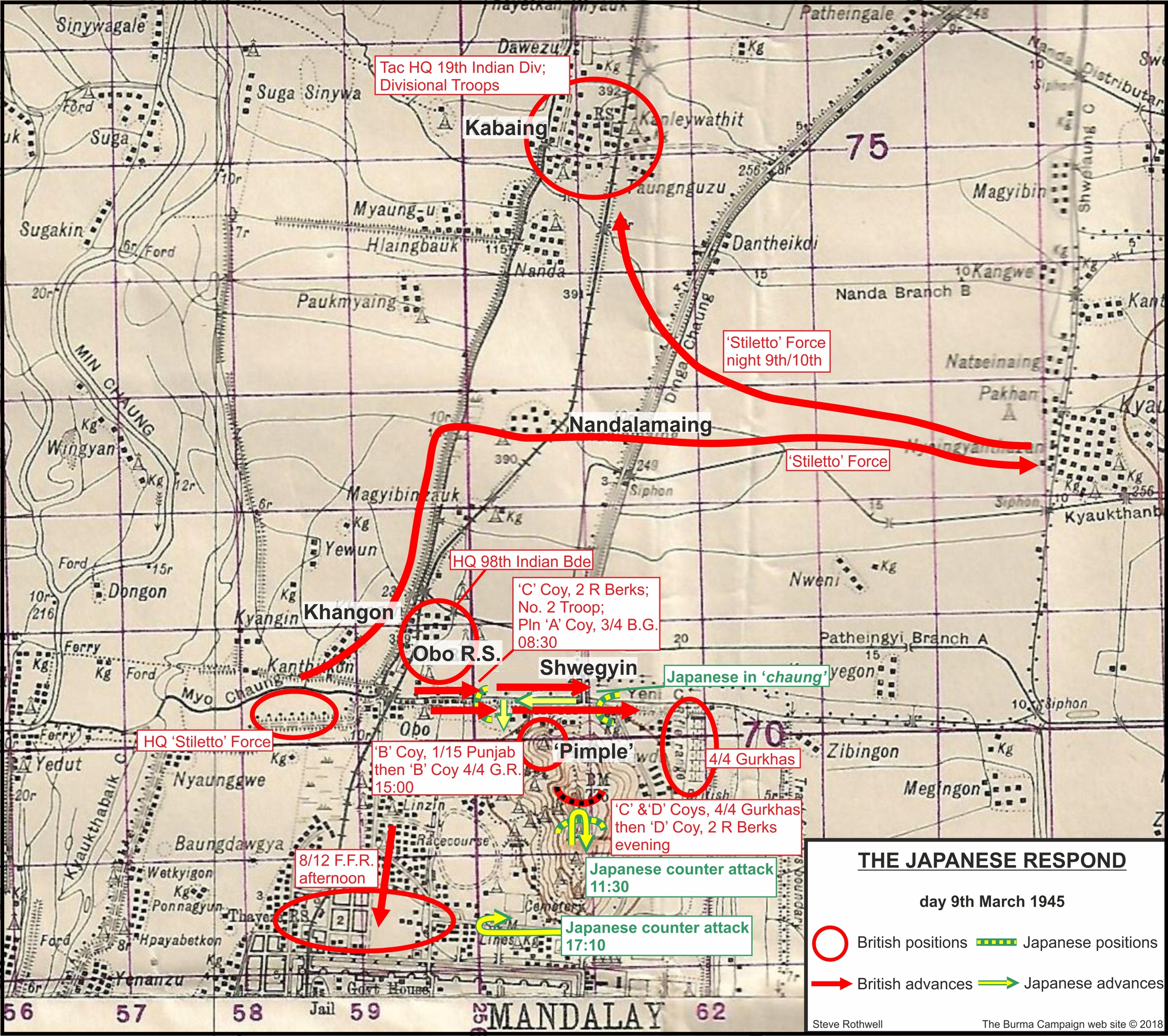 For Major Hill and his men, this sight was the culmination of a long march that had begun in Assam, India, back in November 1944. Following the defeat of the Japanese offensive at Kohima and Imphal, the 14th Army went on the offensive with the objective of recapturing Burma. As part of the Army’s advance to the Irrawaddy River, the area to the east of the Chindwin River was to be seized by the XXXIII Indian Corps, of which the 19th Indian Infantry Division and the 2nd Battalion, Royal Berkshire Regiment were a part. The Corps had orders to capture Monywa, occupy the Yeu-Shwebo area north-east of Mandalay and then to cross the Irrawaddy and take Mandalay itself. Against scattered Japanese resistance, the advance progressed well. On the nights of 13th/14th and 14th/15th January, the eastern-most division of the Corps, the 19th Indian Infantry Division, made two crossings of the Irrawaddy; at Thabeikkyin and Kyaukmyaung. The bridgeheads were immediately consolidated and enlarged whilst the Japanese bridgehead on the west bank was destroyed. By the end of January, the Japanese 15th Division had assembled sufficiently strong forces to attempt to eliminate the bridgeheads but soon realised that the best they could achieve would be to contain them rather than destroy them. Towards the end of February even this limited objective had to be abandoned and on 23rd February, the 19th Indian Infantry Division advanced out of the bridgeheads, heading south towards Mandalay. By the evening of 4th March, the Division’s 98th Indian Infantry Brigade had established a bridgehead across the Chaungmagyi Chaung and as the 62nd and the 64th Indian Infantry Brigades drew up from the north, preparations were made for the final drive to Mandalay.[2]