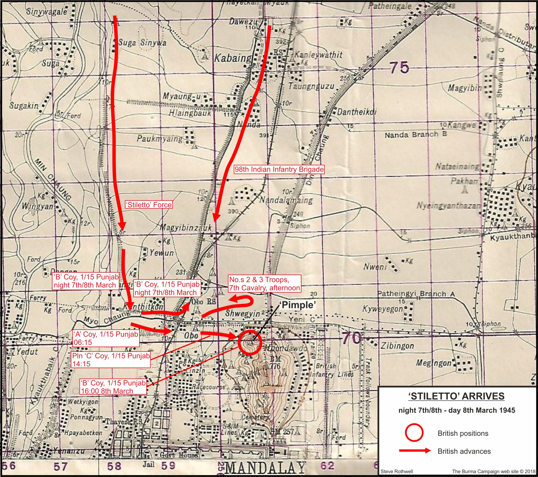 It was then decided to occupy a small hill feature, referred to as the 'Pimple’, on the north west end of Mandalay Hill (map reference 606700). A platoon from 'C' Company, 1st Battalion, 15th Punjab Regiment, set off at 14:15 with support from the medium machine guns of the 11th Sikhs, two Stuart tanks of the 7th Light Cavalry and a third Lee medium tank which had just arrived. The Punjabis occupied the feature by 15:30, against little opposition and with no casualties. The enemy were found to be dug in on the reverse slope of the feature and were dealt with by grenades; twelve enemy dead being counted. 'B' Company then came up to relieve the platoon and was established by 16:00, despite coming under fire from the higher slopes of Mandalay Hill. From this, it became obvious that the Japanese occupied the hill in some force. During the afternoon, the area occupied by the Tactical Headquarters of 'Stiletto' Force to the west of Obo came under heavy Japanese shelling and one of the Lees damaged earlier and evacuated for repairs, was hit again and burnt out.[6]