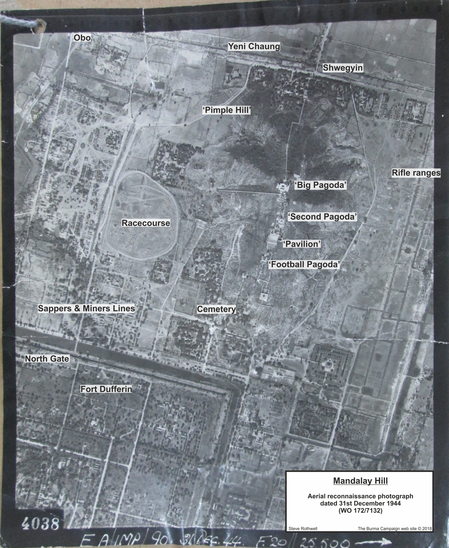 An aerial reconnaissance photograph of northern Mandalay, taken 31st December 1944. Clearly seen are: Mandalay Hill (top centre); the racecourse (to the left/west of the hill); the road leading to Fort Dufferin; the north moat and bridge across to the North Gate. (War diary 98th Indian Infantry Brigade, WO 172/7132.