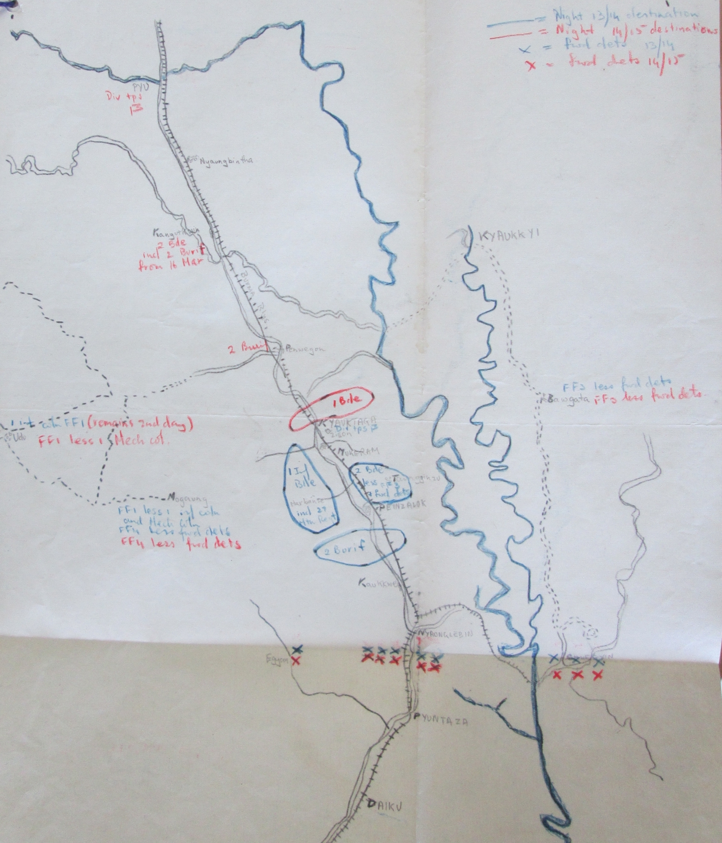 “In the evening of 16th April when at _________ (I forget the name of the place but the road goes right to Kyaukpadaung and a left branch goes to Chauk [the village is Gwegyo]), I was ordered to detail two F.Fs. to proceed to the two tracks between the two routes MAGWE – YENANGYAUNG, TAUNGDWINGYI – NATMAUK along which 1 Burdiv and 17 Div respectively were withdrawing. I proceeded there and gave orders to the Os.C. [Officers Commanding] F.F.1 & F.F.3 (Majors D.R. Turner[48] and J.H. Turner). I was about to return to Corps H.Qrs about 2030 hours but stopped to speak to Capt. Forbes. A station wagon passed me proceeding in the direction of the village where the Kyaukpadaung and Chauk roads fork. When it reached a point about 500 yards ahead, just before the rise in the ground, a sudden burst of L.A. [light automatic] fire was heard and the station wagon burst into flames. F.F. Commanders were called and ordered to arrange local protection while proceeding with their preparations to move as ordered. Shortly afterwards the driver of the station wagon came in and reported that the fire had come from the East of the road. Several vehicles from the North then came through unmolested. About this time 2 Bn. R. Tanks Corps [2nd Royal Tank Regiment] arrived. The officer commanding was given all information and stated that he proposed to push on, so I ordered F.Fs. 1 & 3 to be prepared to follow the Tanks. The first tank went up the road and when opposite the burning station wagon, one of its tracks was blown off by a grenade or mine and the road was blocked. O.C. 2nd Bn. R.T.C. [2nd Royal Tank Regiment] then decided to remain for the night or until the