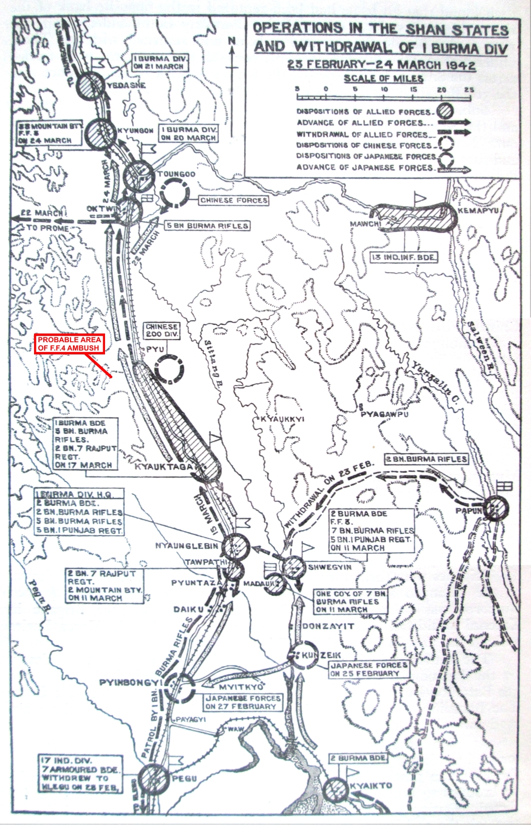 The 1st Burma Infantry Division gave orders for F.F.4 to act as flank guard on the Division's right flank for the attack on Pyuntaza, beginning on 11th March. Scott's No. 3 Column was detached to move further South with orders to form a roadblock on the main road between Pyuntaza and Pegu should the main attack on Pyuntaza succeed. The attack did not succeed and Scott and his men fell back to a rendezvous point hoping to rejoin the main body of F.F.4. On reaching the rendezvous they found that F.F.4 had gone, as part of the planned withdrawal of the 1st Burma Division. F.F.4 was now under the command of the 1st Burma Brigade. As part of the general withdrawal order for the night of 13th/14th March, the detachment, less Scott, was to move from the area of Nyuaunglebin to Mogyaung.[20]