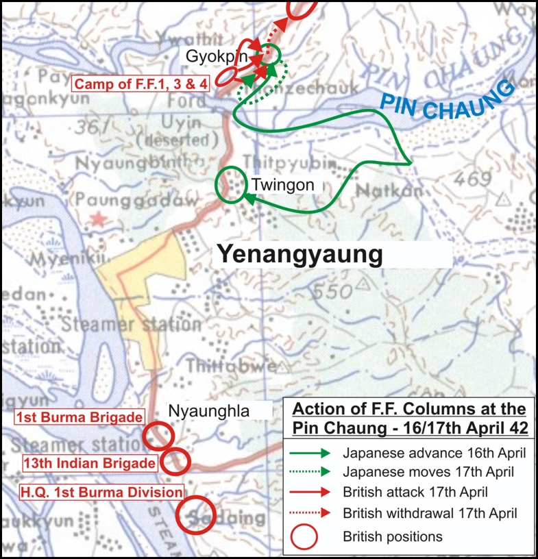 Sometime on or just before 16th April, the newly formed mobile detachments, F.F.1, F.F.3 and F.F.4, moved back to the North of the Pin Chaung where they were camped prior to being sent out as an information screen. By now the 1st Burma Infantry Division had withdrawn from the Magwe area to Yenangyaung, South of the Pin Chaung.[46] It was then that a new threat to the 1st Burma Infantry Division emerged. What follows is described by Lt. Colonel G.G. Pryce (Commander Corps, Burma Frontier Force, attached to Headquarters, 1st Burma Corps):[47]